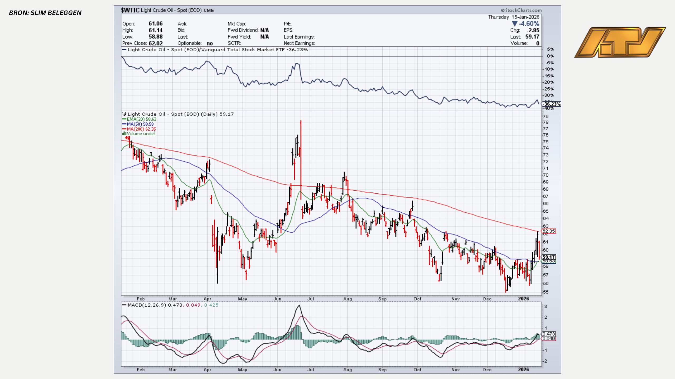 De internationale olieprijs is met ruim vier procent gedaald nadat de Amerikaanse presidentDonald Trump verklaarde dat het geweld tegen demonstranten in Iran is verminderd. Daarmeenam de bezorgdheid over een mogelijke militaire escalatie en verstoring van de olievoorzieningaf. Op de markten werd dit vertaald in een lagere geopolitieke risicopremie. Tegelijkertijd zorgdenvooruitzichten op extra aanbod, onder meer vanuit Venezuela, voor extra neerwaartse druk op deprijzen.